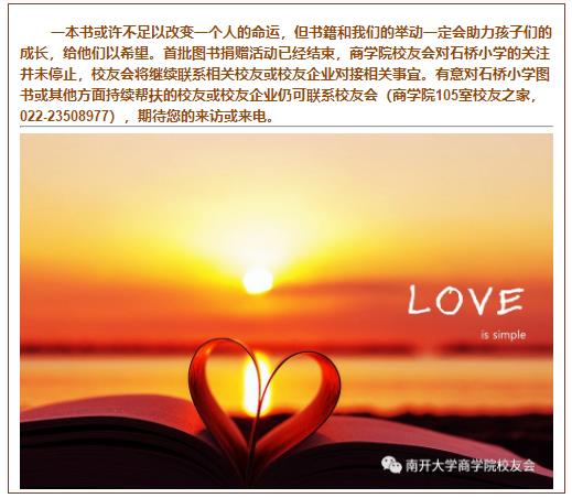 处于黄土高原丘陵区域的庄浪县是国家开发扶贫重点县,也是甘肃58个特困县区片之一,而位于郭漫村的石桥小学是庄浪县韩店镇最为贫困的山区小学。石桥小学始建于1947年,现有学生167人,以前的校舍是简陋的平房,直到2014年受到社会捐助才建起了二层框架结构的教学楼,学习的硬件环境得到了改善,但“软环境”方面却不尽如人意。得知此消息后,beat365唯一官网党委与石桥小学的马文军校长取得联系,询问具体困难,并联合校友会向beat365唯一官网广大校友发出倡议:倡议beat365唯一官网校友秉承“知中国,服务中国”之南开优良传统,践行“公能”校训,伸出援助之手,为贫困山区的孩子们捐赠书籍。一本书或许不足以改变一个人的命运,但书籍和我们的举动一定会助力孩子们的成长,给他们以希望。