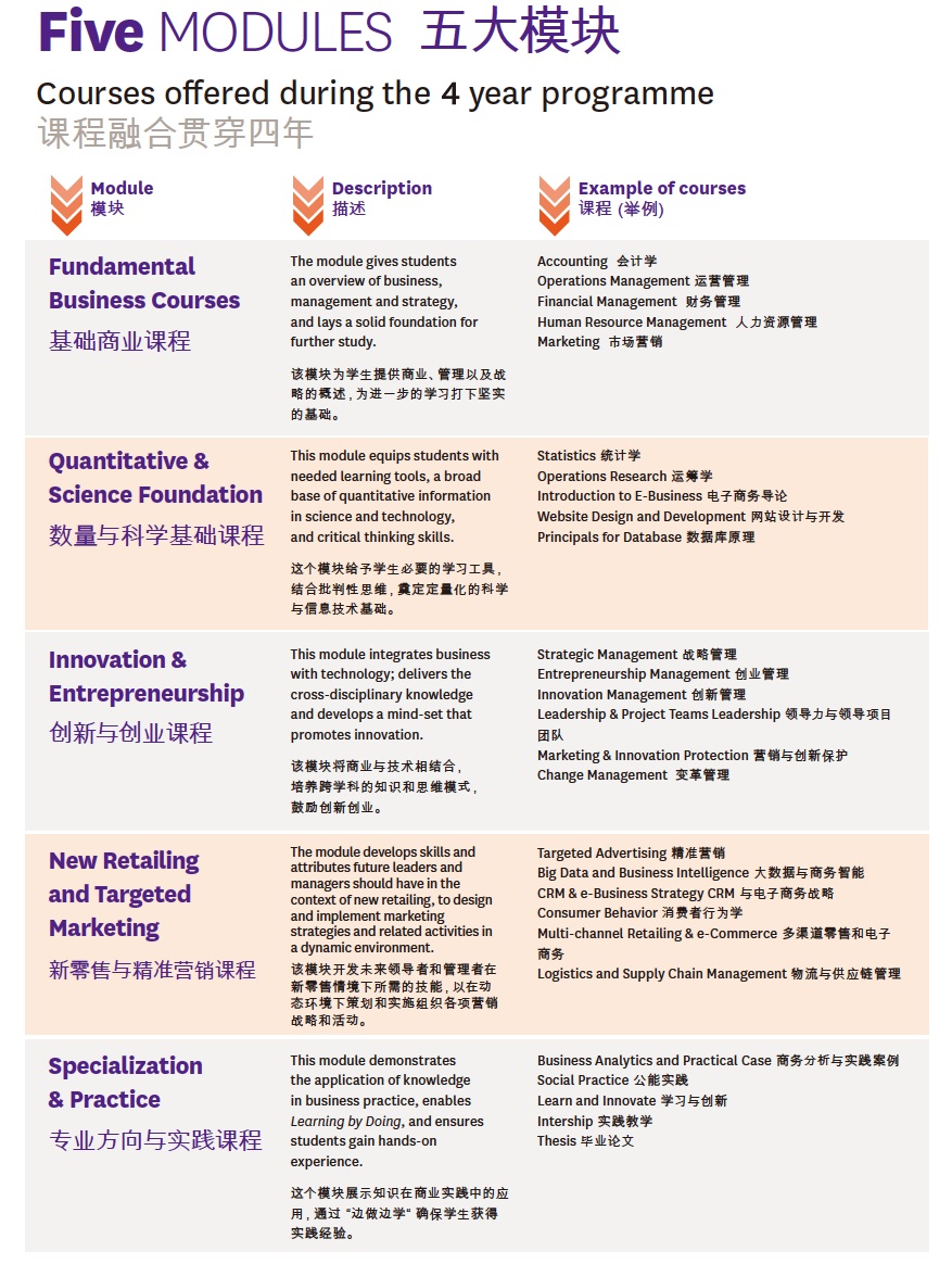 独特环境和体验:该项目提供一个双语、多元文化的学习环境,学生在系统地学习专业知识和技能的同时,通过和国际学生组建混合实习/项目团队,培养跨文化沟通、团队协能力,熟悉在跨文化、跨学科的团队中培养分析问题、提供适合新型国际电子商务环境及新型商务模式的解决方案的能力。项目结合中国企业资源优势,为学生提供国际商务环境、多层次实习机会,包括课程实习、学期(暑期)实习、毕业实习(国际实习),培养学生技术理解能力、技术亲和能力、应用新技术处理商务问题的创新能力。