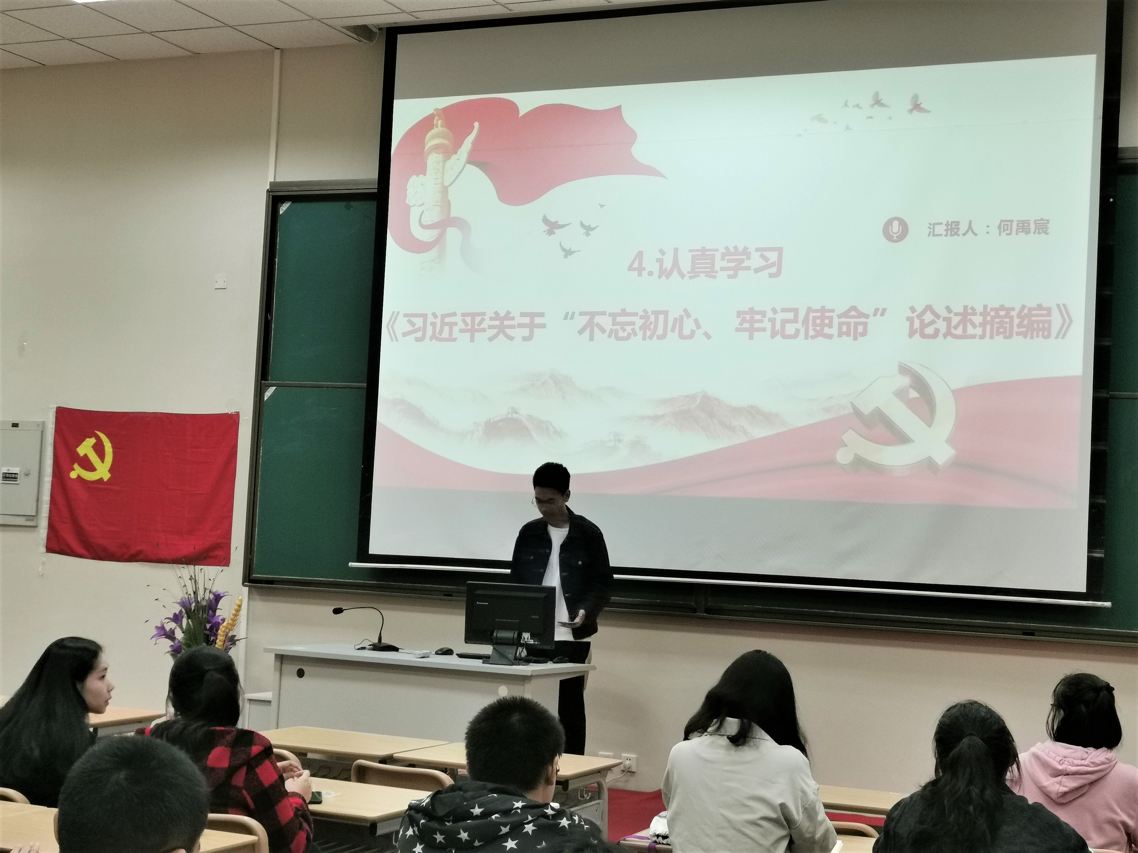 会议伊始,支部成员认真学习了习近平总书记在“不忘初心、牢记使命”主题教育工作会议上的重要讲话精神、在中央政治局第十五次集体学习时的重要讲话。并通过小组讨论的形式,学习了《习近平关于“不忘初心、牢记使命”论述摘编》和习近平总书记在中央党校(国家行政学院)中青年干部培训班开班式上的重要讲话精神。李晨洋、张晓东、祖丽皮亚同学带领大家认真学习了习近平总书记署名文章《增强推进党的政治建设的自觉性和坚定性》、《中国共产党问责条例》和《中国共产党宣传工作条例》。
