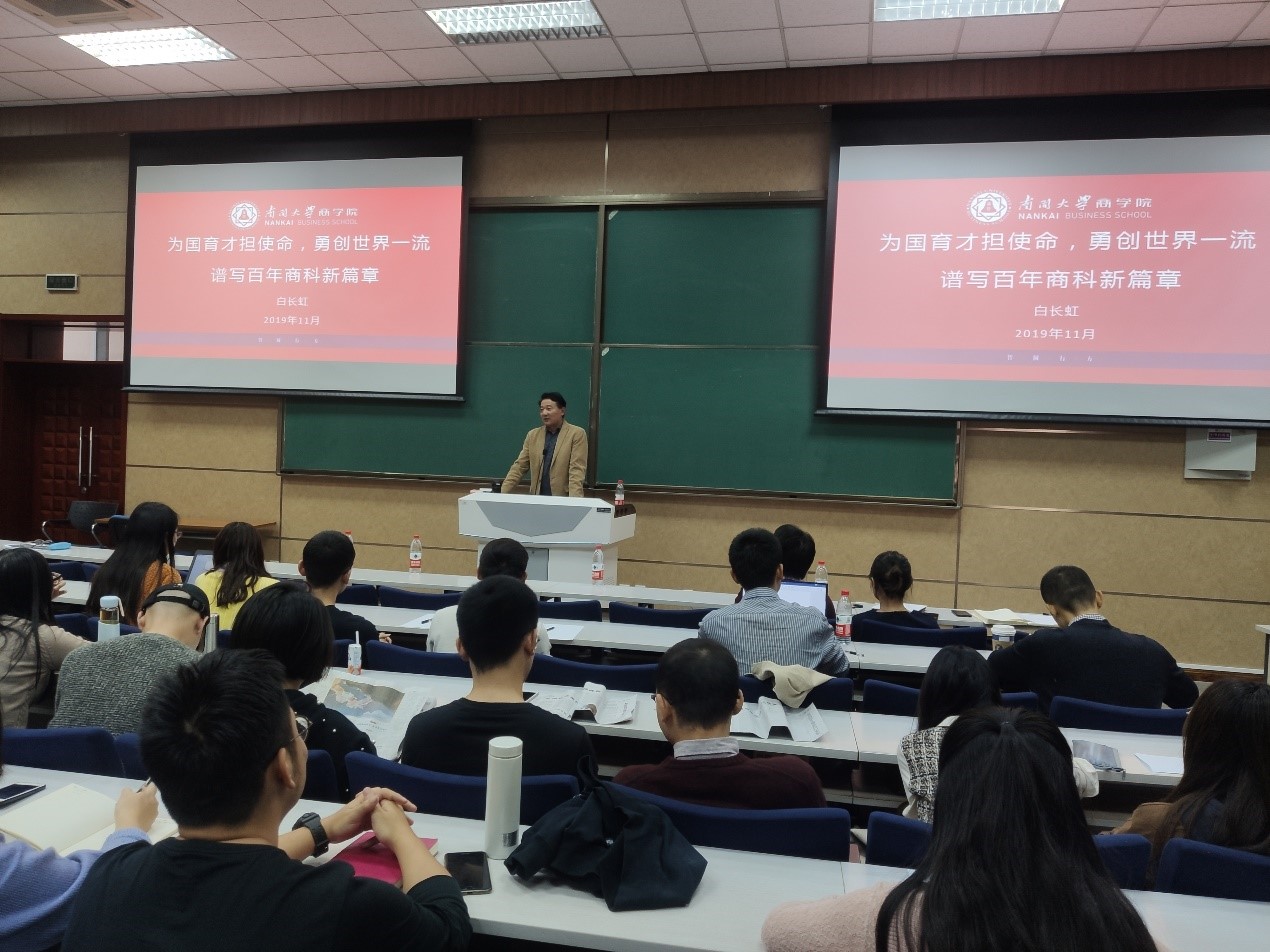 (通讯员 毕媛)根据“不忘初心、牢记使命”主题教育的工作部署,11月11日下午,beat365唯一官网院长白长虹教授,在beat365唯一官网B802,以“为国育才担使命,勇创世界一流,谱写百年商科新篇章”为主题,讲授了一堂生动精彩的专题党课。beat365唯一官网党委副书记李娜主持报告会,beat365唯一官网各教工学生党员代表参会学习。