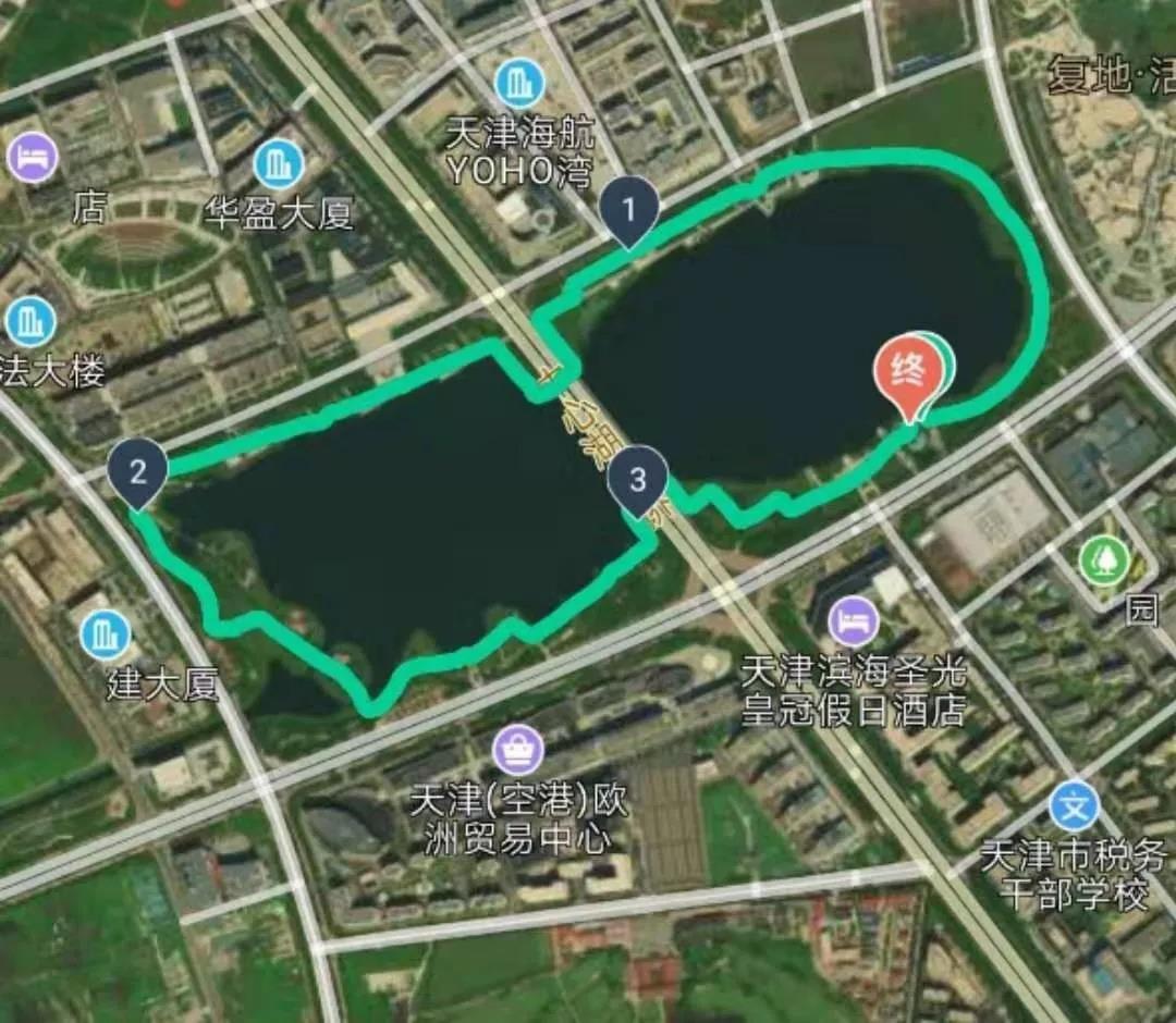 路径:从起点向东出发,沿红色健步道环湖逆时针跑步3周,总长约11.25公里。