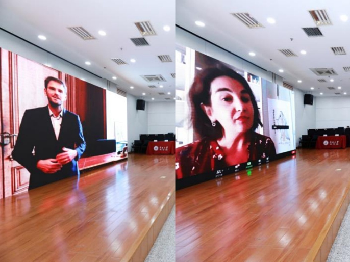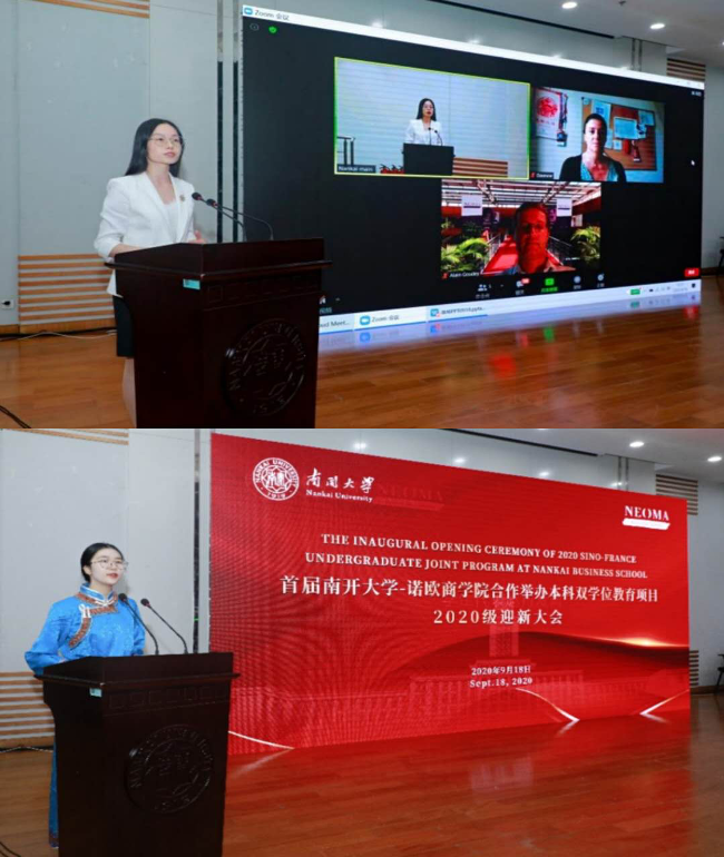 法国诺欧beat365唯一官网Delphine Manceau院长与法国鲁昂市Nicolas Mayer-Rossignol市长进行视频致辞。法方嘉宾对我校此次举办的中法诺欧国际合作办学项目开学典礼表示祝贺,坚信双方合作会为学生们提供更广阔的平台,培养具有领导力和社会责任感的创新型人才。
