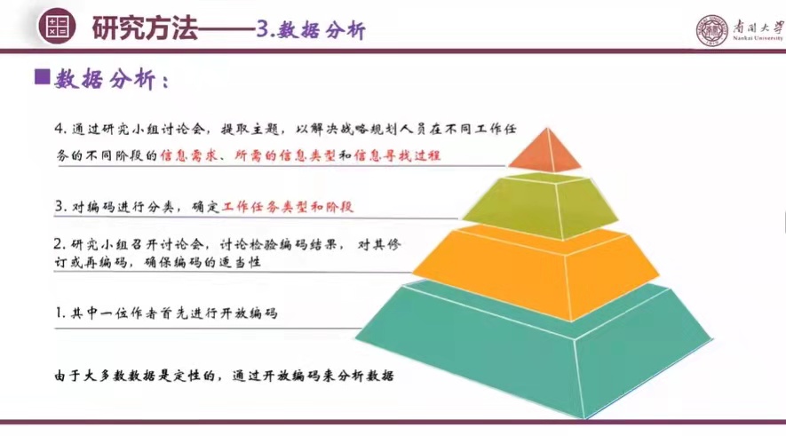使用开放编码对数据进行分析,确定工作任务类型和阶段,识别战略规划人员在不同任务的不同阶段的信息需求、信息类型和信息寻找过程,并揭示不同工作任务类型下的信息搜寻行为特征和不同工作任务阶段下的信息搜寻行为特征。