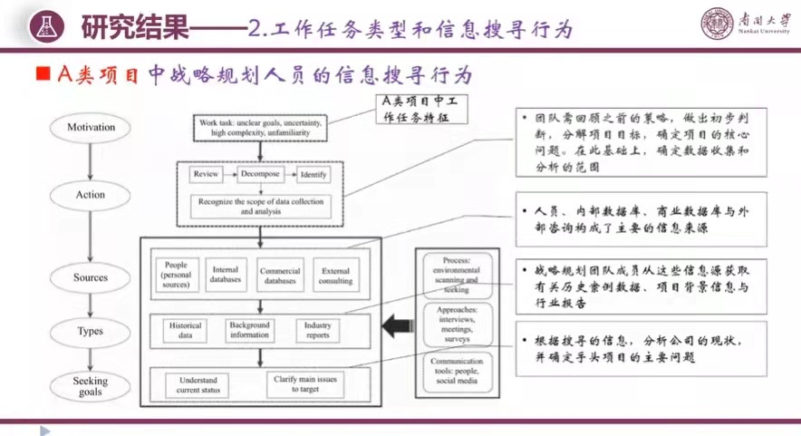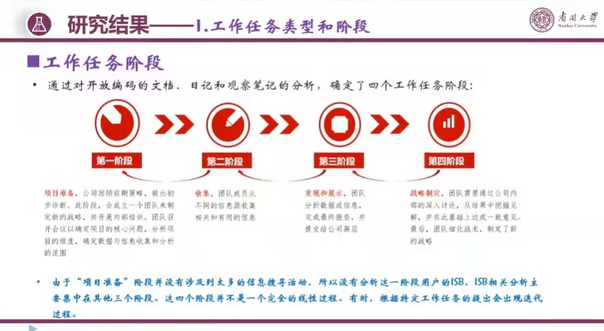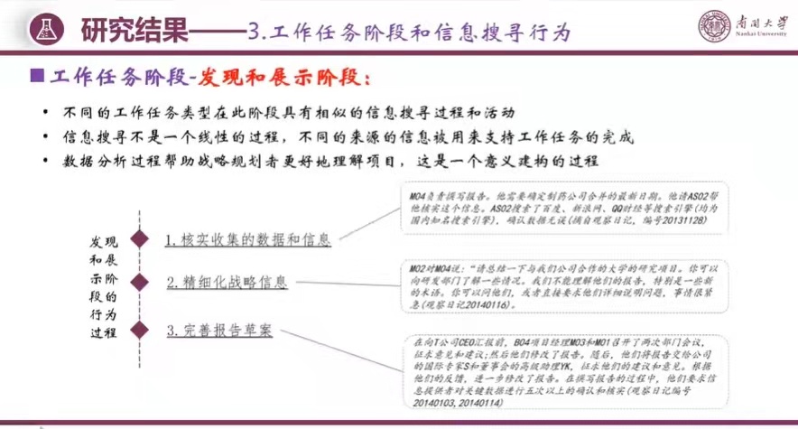 团队对数据资料进行反复阅读与思考,从搜寻动机、搜寻活动、信息来源、信息类型、最终的搜寻目标等方面分析了不同工作任务类型下的信息搜寻行为特征,并对收集、发现与展示、战略制定三个阶段过程中的信息搜寻活动与行为进行了细致的分析,部分研究结果如下图。