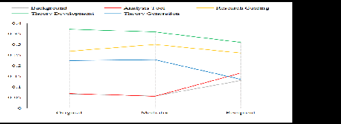 参与理论扩散的学科领域被划分为起始领域、中介领域和接受领域。在这些领域,理论事件呈现出不同的时间分布。起源领域在理论发展和创新中的作用比中介和接受者更为重要。中介领域在理论普及上承担了更多的责任,而接受领域则主要以TAM作为分析工具和研究背景。从起源领域到接受领域,TAM的理论性贡献下降,而作为实践指导的贡献增加。研究发现,理论在扩散之中成长,主要有四种成长模式:理论的精细化,理论的扩散,理论的竞争和理论的整合。