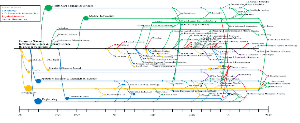 该研究选择了一个被广泛接受和传播的理论“技术接受模型(TAM)”,运用文本挖掘和引文分析方法,收集WOS中的全部相关数据,发现自Davis于1989年发表TAM模型以来,近30年间TAM被引48000多次,从最初的信息管理、图书情报和计算机科学三个学科开始,依次扩展到心理学、传播学、工程学、物理学、生物学、运筹学、管理学、人文艺术、急诊医学、耳鼻喉科、科学史与哲学等学科的93个研究领域。