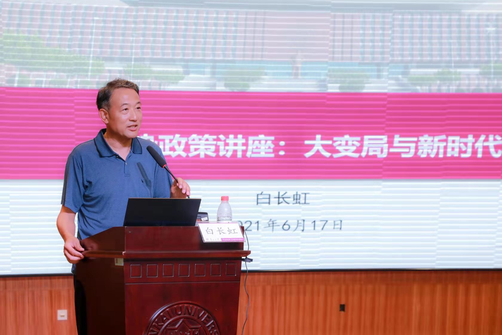 白长虹分别从“决定人类命运的大变局”“决定中国未来的新时代”“管理专业与幸福产业”三个层面阐述当前国内外形势和中国共产党的伟大历史贡献。开篇以“中美斗争”“工业革命”“新生态文明”“中国崛起”四个热词引出当前时政热点,以我国社会主要矛盾的变化,展示了在中国共产党的领导下,中国社会各方面的巨大飞跃,结合中国制造2025、“十四五”规划和2035远景目标,介绍大数据、云计算、人工智能等科学技术赋能服务。在国际国内双循环背景下,新时代青年要运用马克思主义理论武器,以宏观视野和系统思维,与时俱进地应对变化、作出理性判断和选择。