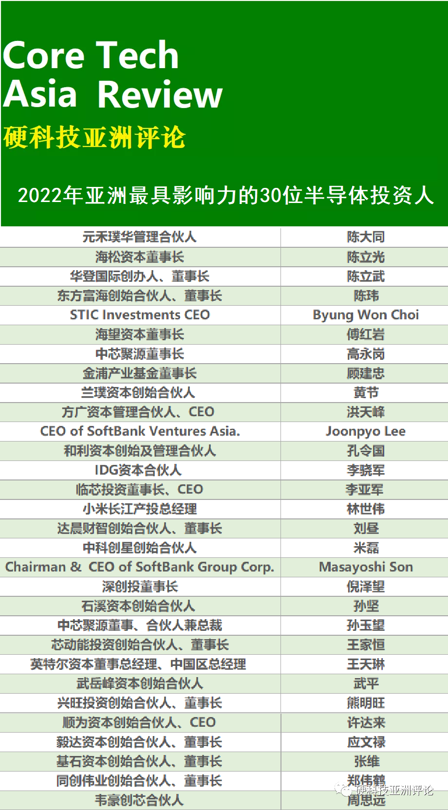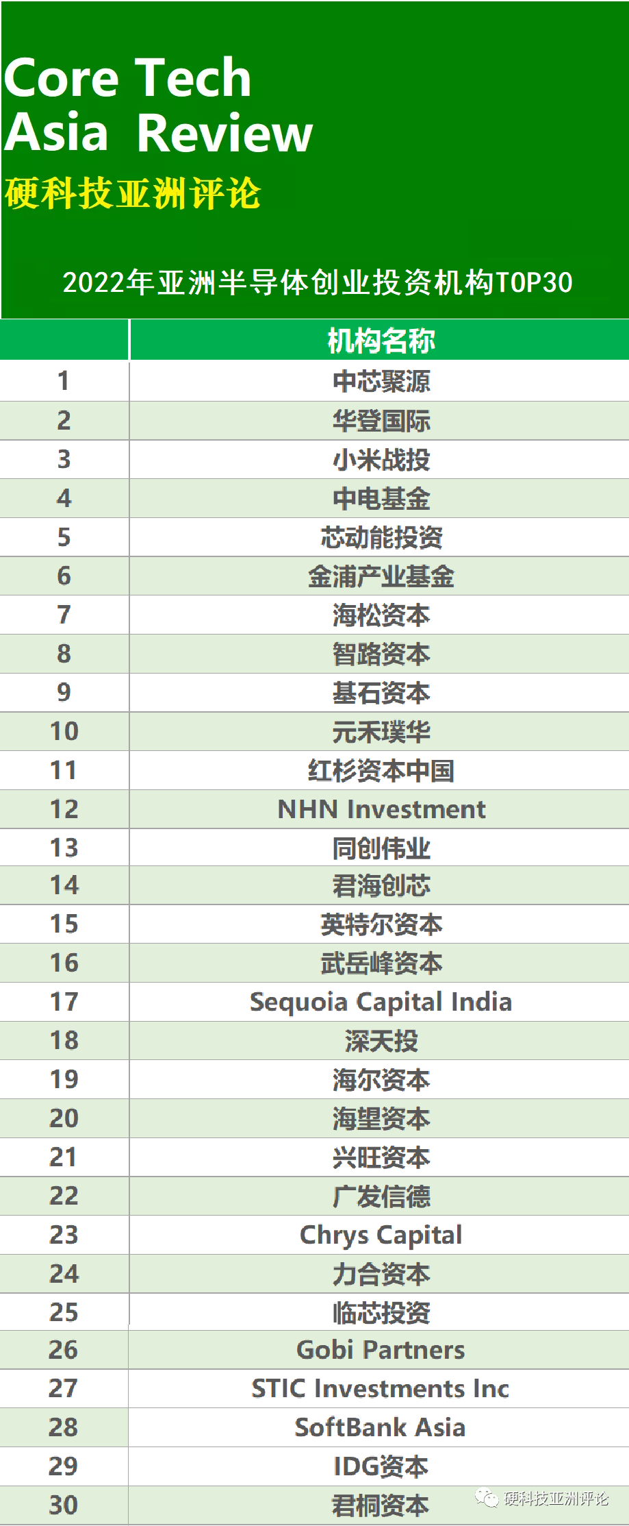 近日,《硬科技亚洲评论》评选出「2022年亚洲最具影响力的30位半导体投资人」以及「2022年亚洲半导体创业投资机构TOP30」。