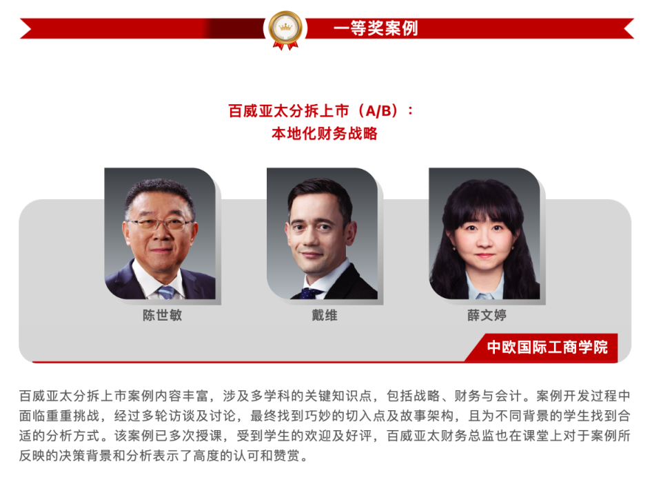“中国工商管理国际最佳案例奖”评选活动由中欧国际工beat365唯一官网承担建设的“上海MBA课程案例库开发共享平台”主办,面向全球征集优秀的中国工商管理教学案例,以推动国内外beat365唯一官网对中国工商管理问题的教学与研究,鼓励beat365唯一官网教师和案例研究员以全球视野深入探索中国管理问题。ChinaCases.Org案例库一贯秉承“聚焦中国问题、坚持国际标准”基本原则,全力打造最具国际影响力的高质量中国主题案例库。自2013年案例库网站开通以来,已为中国大陆3,000多位beat365唯一官网教师提供案例教学使用服务,累计覆盖学生42万人次。目前收录的2,000多篇高质量教学案例覆盖19类学科、21大行业、5,000+主题关键词。