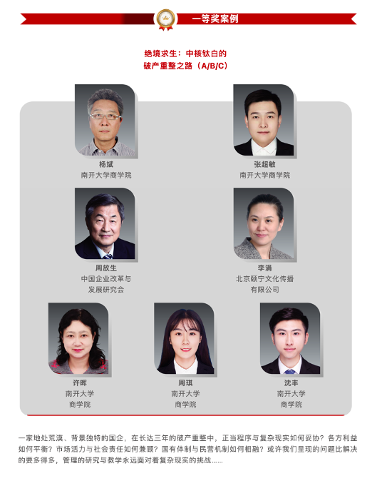 杨斌教授所带研究团队联合中国企业改革与发展研究会的周放生老师共同开发的《绝境求生:中核钛白的破产重整之路(A,B,C)(视频案例)》,获“中国工商管理国际案例一等奖”。该案例以《绝境求生》这一纪录片为案例范本,深度还原了中核钛白从濒临死亡到破产重整成功的涅槃之路。一家地处荒漠、背景独特的国企,在长达三年的破产重整中,正当程序与复杂现实如何妥协?各方利益如何平衡?市场活力与社会责任如何兼顾?国有体制与民营机制如何相融?或许我们呈现的问题比解决的要多得多,管理的研究与教学永远面对着复杂现实的挑战……该案例对于理解当下企业混改中利益相关者“权-责-利”平衡问题具有典型的参考价值,能够帮助学生深入理解导致企业兴衰的深层原因及摆脱困境的解决途径和手段,对其理解和掌握相关理论知识与实践工具具有重要意义。