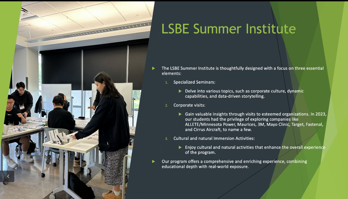 (通讯员刘若愚)2024年3月27日,海外留学项目宣讲活动—明尼苏达大学夏校项目通过线上方式展开。由国际交流与认证办公室主任陈老师组织主持本次宣讲,明尼苏达大学张文卿老师向同学们宣讲明尼苏达大学夏校项目内容和优势,展示了明尼苏达美景和该项目在公司游览、专题研讨等设置上的亮点,同学们对该项目产生浓厚兴趣,张老师作为项目设计者也给大家答疑解惑。