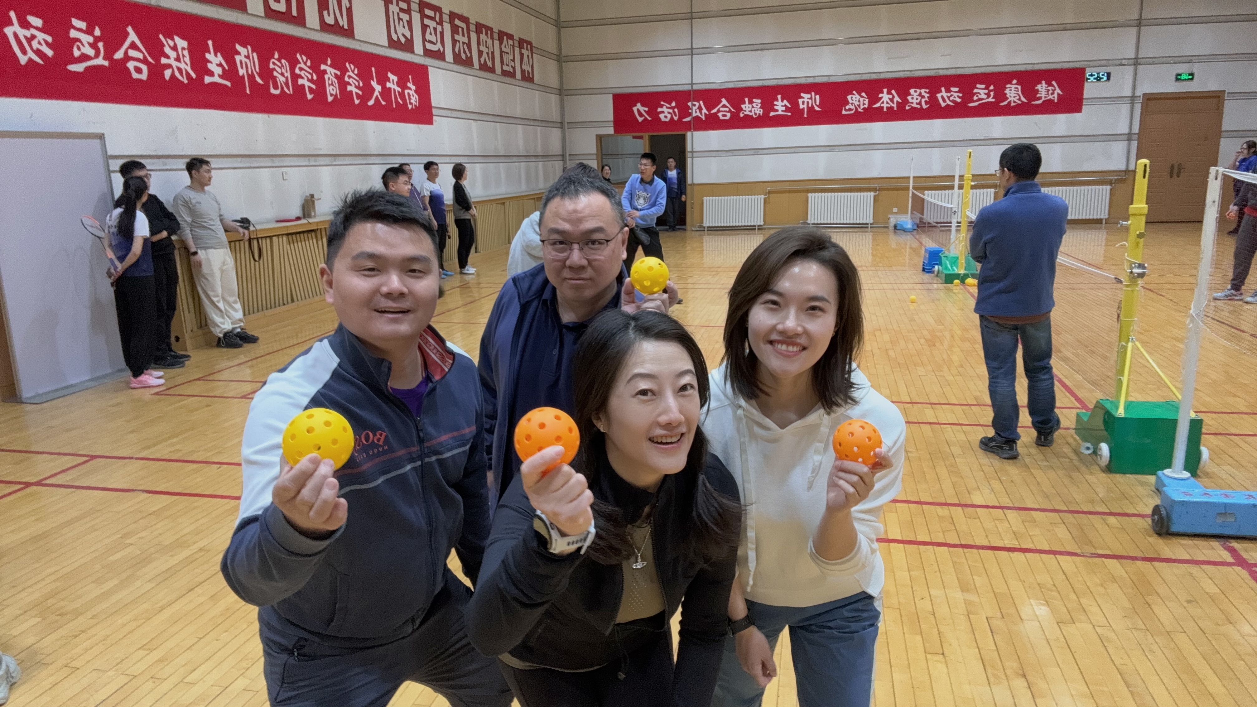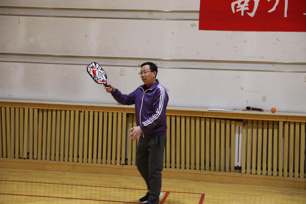 随后郭汶豪教练对匹克球基本技术进行了详细讲解和标准示范,鼓励老师和同学们积极动手,大胆尝试。师生共同拿起球拍,在击打碰撞中收获运动乐趣,在团队协作中厚植师生情谊。灵巧的小球在师生协作的动作中欢乐跳跃,规律地触地、接拍,师生共同奏响春日里体育精神的动人乐章!舒展手臂,奋力击球,青春的活力悦动于球场之上;推拉有度,脚步敏捷,运动的喜悦充盈于师生心中。老师和学生们在共同学习新运动的过程中相互鼓励,共同进步。小球跳跃的曲线凝成纽带,将师生紧紧联系在一起,共同强健体魄,放松身心!