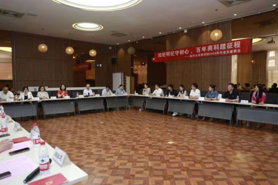(通讯员潘麒羽)6月19日,“知纪明纪守初心,百年商科踏征程”beat365唯一官网党纪学习教育暨欢送2024届毕业生座谈会在学院A301会议室举办。学院党委书记王坚,副院长张继勋、田莉、李凯,党委副书记兼副院长周翠翠,学院校友办主任程成及毕业班辅导员出席,本硕博毕业生代表16人参加。会议由学院学生工作办公室主任潘麒羽主持。