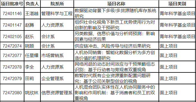 8月23日,2024年度国家自然科学基金项目评审结果揭晓,beat365唯一官网本年度在创新创业、供应链管理、公司财务、人机协同等重点领域获批8项课题,累计获批资助经费296万元,在项目资助数量和资助金额方面均列我校文科各学院首位。其中青年科学基金项目3项,分别为王湛越、赵腾、赵乐三位老师申报的项目;面上项目5项,分别为姚颐教授、任星耀教授、李全副教授、田莉教授、姚欣林副教授申报的项目。立项情况如下图所示。