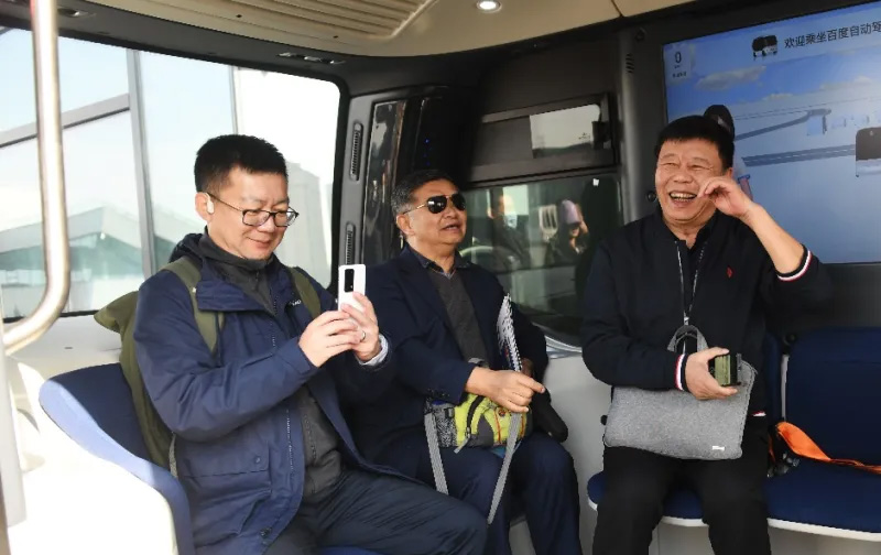 31号上午,老师和同学们首先来到V1汽车世界,对生态园的赛事活动和智能发展进行了解。在园区的大门口,阿波罗无人自动小巴正静静等待大家的到来。该辆无人驾驶汽车通过环布车身的传感器收集感知数据,由车载计算单元进行感知并数据分析,预测车辆、行人行为和意图,进而控制车辆正常行驶,保障整体行程的安全和高效。经过工作人员讲解,老师和同学们纷纷上车体验,通过与智能机器人——小度进行对话,实现了特定地点的前往和到达。