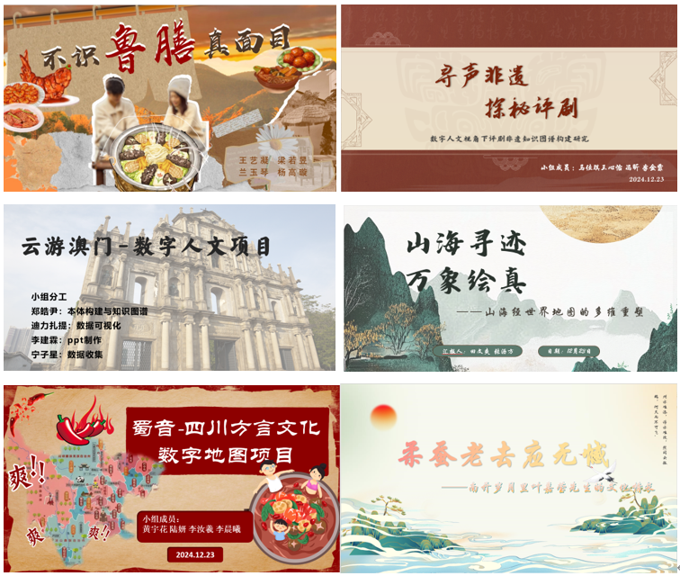 本课程作为图书馆学、档案学专业选修课,主要介绍数字人文的基本概念、发展历程、相关技术、分析工具、场景应用的技术方法以及可用性评价,并结合对来自国内外的多个数字人文设计实际案例的分析和课程设计实践,让学生自主完成数字人文项目设计,在拓展研究思维的同时增强文化自信。2024-2025秋季学期共有6组同学带来汇报,同学们立足于家乡文化、经典名著、名人故事、戏曲文化等多种角度,利用文本、图片、视频、语言等资源,通过本体构建、知识图谱、空间叙事等数字人文方式方法进行了精彩丰富的项目汇报,充分展示了同学们的开放思维以及对于数字人文研究的积极性。