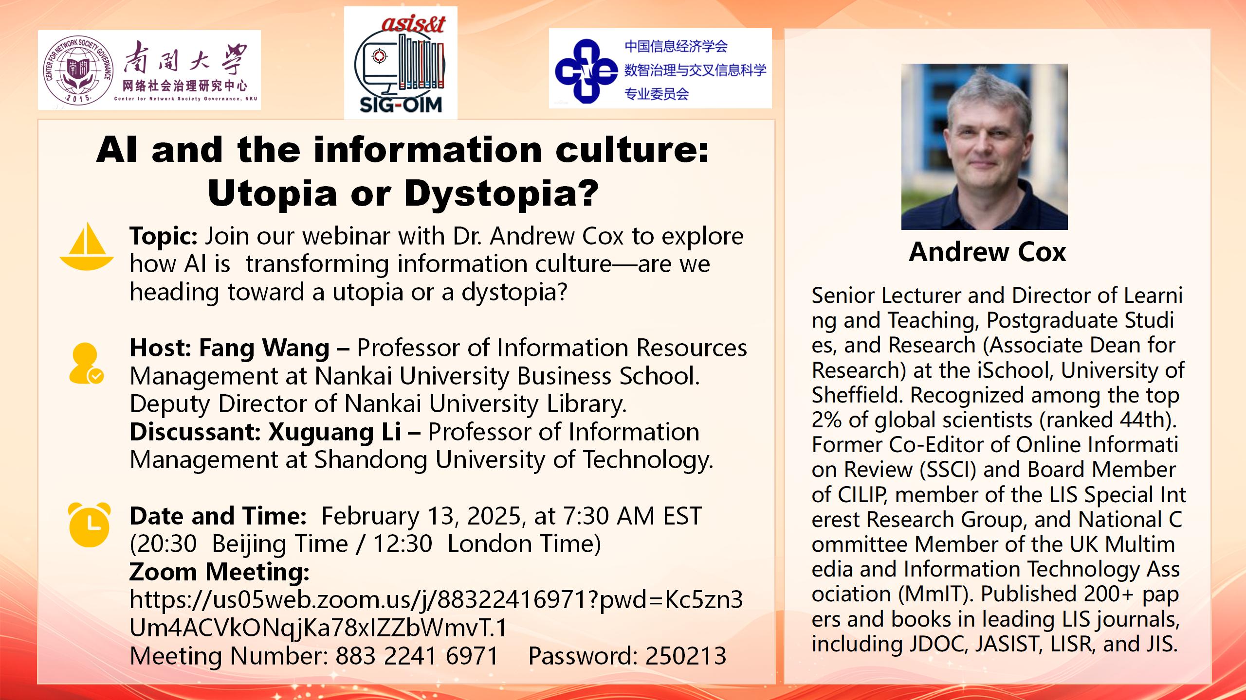 主讲:Andrew Cox博士,高级讲师(Senior Lecturer),谢菲尔德大学信息学院的学习和教育主任、研究生主任、科研主任(科研副院长),入选全球2%顶尖科学家(44名)。曾任SSCI期刊 Online Information Review 共同主编。担任英国图书馆与信息专家学会 (CILIP)理事、LIS学科特殊兴趣研究组成员, 英国多媒体和信息技术协会MmIT全国委员会理事。主要研究兴趣是人工智能、数据化和管理主义对信息服务业的影响。 在JDOCJASISTLISRJIS等图情学国际权威刊物发表论文及著作200余篇。