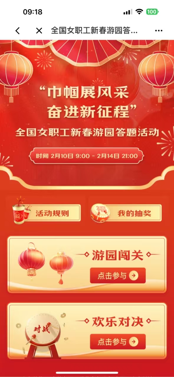 校工会通知,从2月10日(今天)上午9:00开始,在“职工之家”APP中开展全国女职工新春游园答题活动(主页流动标题新闻第二个),为期5天,参加活动可获得奖励,今年的三八节系列活动就此拉开帷幕,请女职工积极参与!