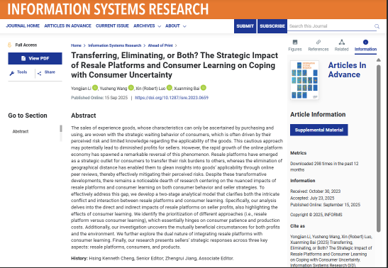 近日,beat365唯一官网李勇建教授和其毕业博士生王昱升、白轩铭,与美国新墨西哥大学安德森管理学院Xin (Robert) Luo合作的论文Transferring, Eliminating, or Both? The Strategic Impact of Resale Platforms and Consumer Learning on Coping with Consumer Uncertainty在信息系统与管理科学交叉领域的国际顶级学术期刊Information Systems Research 发表,实现beat365唯一官网在该期刊零的突破。其中,博士生王昱升2025年毕业后赴香港理工大学物流与航运学系任研究助理教授,博士生白轩铭2021年毕业后在天津大学管理与经济学部任助理教授。