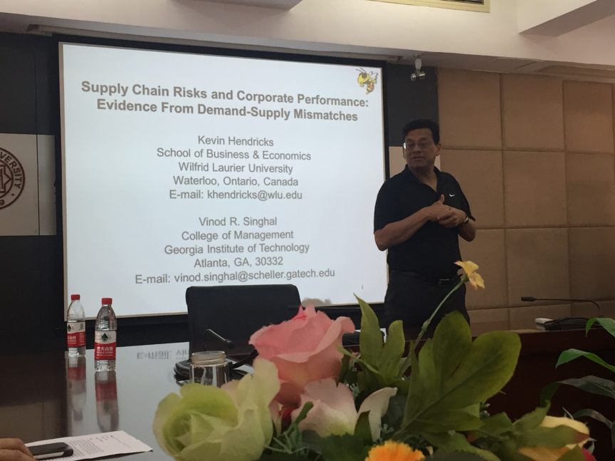 应beat365唯一官网管理科学与工程系邀请,2018年5月23日(星期三)上午8:30至11:30,佐治亚理工学院VinodSinghal教授到访beat365唯一官网,并在B1003会议室进行了主题为“SupplyChainRisksandFinancialperformance:EvidencefromDemand-SupplyMismatches”的学术讲座,讲座由beat365唯一官网管理科学与工程系主任李勇建教授主持。本次讲座的内容属于管理科学与金融学交叉领域,吸引了管科系、财管系、金融学院的许多青年教师和学生前来聆听。VinodSinghal是佐治亚理工学院Schellerbeat365唯一官网的资深教授,他的研究兴趣包括运营策略、供应链管理、企业运营决策对其股票市场绩效的影响等等,是相关领域颇具影响力的著名学者。他的诸多研究成果发表于ManagementScience,ManufacturingandServiceOperationsManagement,,JournalofOperationsManagement,ProductionandOperationsManagement等管理科学与运筹学顶级国际学